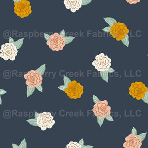 Vintage florals in pink, cream and yellow on a navy blue background, ditsy floral, vintage blooms collection