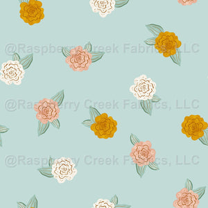 Vintage florals in pink, cream and yellow on an aqua background, ditsy floral, vintage blooms collection