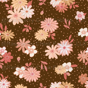 Vintage Flowers Collection - 70s vibe floral on brown background, handdrawn pattern print by Annette Winter