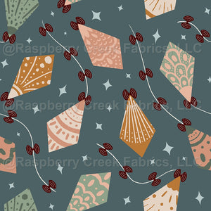 hand drawn vintage kites with art deco inspired detailing flying through the sky in the starry night above the ocean