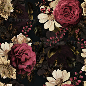A luxurious enchanting masterpiece of floral picturesque design with beautiful antique dark shiny vintage rose flowers painted by Dutch and European famous painters,