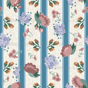 Vintage pink and purple flowers with blue and light blue stripes and a cream damask background