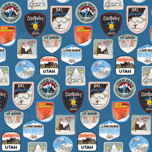 Retro ski resort badges pattern on a medium blue background featuring classic mountain destinations in a hand-drawn vintage style.
