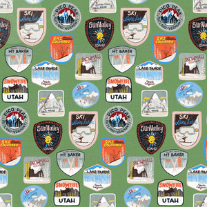 Retro ski resort badges pattern featuring classic mountain destinations in a hand-drawn vintage style.