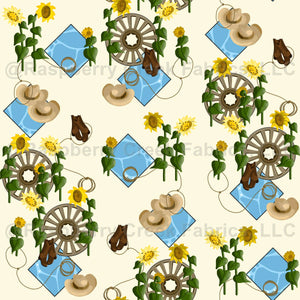 Wagon wheels, sunflowers, cowboy hats and boots, lassos, and blue bandanas create a fun western design on cream.