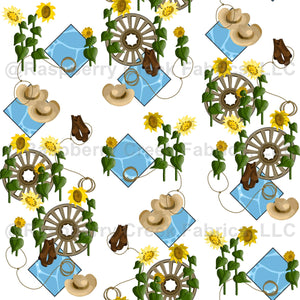 Wagon wheels, sunflowers, cowboy hats and boots, lassos, and blue bandanas create a fun western design on white.