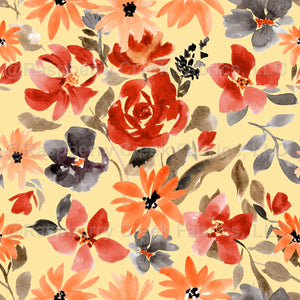 Watercolor Autumn Flowers in Red, Orange and Purple on Fall Yellow Background