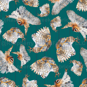 Hand painted with watercolors by traditional method these are two flying Barn owls arranged in a random manner with abstract lines presenting woods.