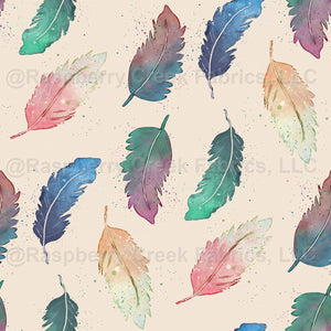 Watercolor boho feathers in two colors blending and splatter in blue, green, pink, orange, and teal in beige