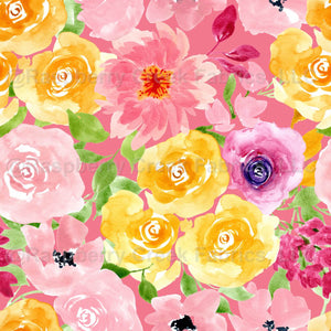A vibrant floral pattern featuring bold yellow roses, pink wildflowers, and soft purple blooms with lush green leaves on a pink background.
