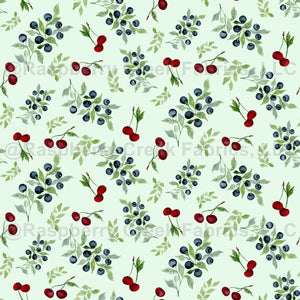 Whimsical watercolor blueberries, cherries, and greenery in a charming fruit pattern perfect for nurseries, kids’ items, kitchen, or seasonal accessories.