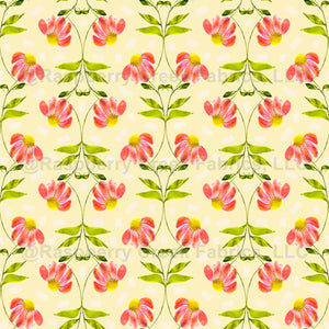 Watercolor Coneflowers in red, pink, green and yellow on mellow yellow with abstract marks. Coordinate for the Garden Wild Floral Collection. Fabric, home decor