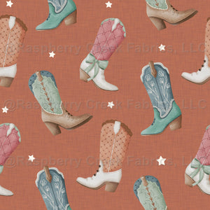 Warm terracotta sets the stage for watercolor cowgirl boots in pretty pastel hues, accented by scattered stars for a fun western vibe. This seamless design is perfect for fall outfits, dresses, pajamas, quilts, accessories, and cowgirl-themed sewing. The hand-painted look and linen-style background bring cozy rustic charm to every creation.