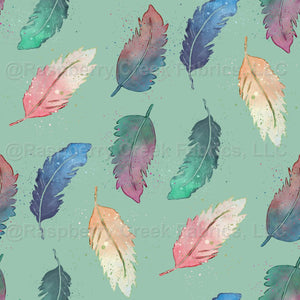 Watercolor feathers in two colors blending in blue, green, pink, orange, and teal in mint green