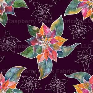 Watercolor pastel poinsettia floral features the Christmas flower in pink, blue, orange, teal, green, yellow. White outlined flowers on a deep purple background. Holiday and Christmas projects, apparel, home decor.
