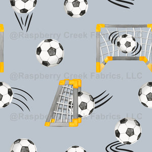 Watercolor Soccer Goals Gray. Black and white soccer balls with gray and yellow soccer ball nets.