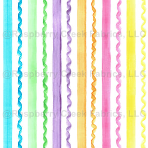 Watercolor painted stripes, straight and wavy in rainbow sherbet colors on white. At default scale, 12" at 150dpi,wide stripes are appx 3/4inch wide; appx. 3/8inch wide at 6" repeat 300 dpi.