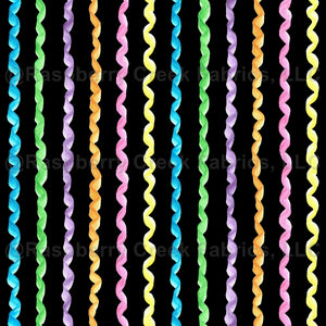 Watercolor painted wavy stripes in rainbow sherbet colors on black. At default scale, 12" at 150dpi, stripes are about half an inch wide; about a quarter inch wide at 6" repeat 300 dpi.