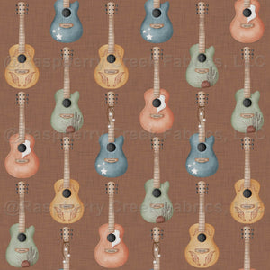 This rustic western guitar print features hand-painted acoustic guitars in warm desert tones, blue, sage, terracotta, and gold, set against a rich brown linen-style background. Perfect for music lovers and little cowboys alike, this seamless design is ideal for tees, dresses, quilts, pajamas, bags, and boutique western apparel. The watercolor texture adds soft charm while the earthy palette keeps it classic and versatile.