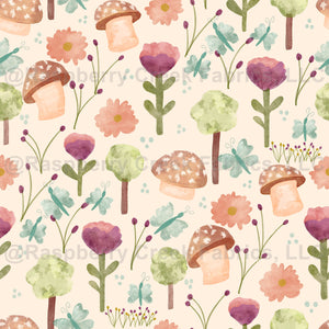 Watercolor Whimsical Woodland Mushrooms, Flowers and Trees in neutral beige