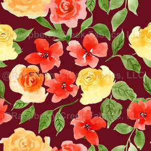 Soft watercolor roses and wildflowers in soft yellow, orange, and red hues with green accents. Perfect for creating elegant fabric and wallpaper with a romantic floral feel. Burgundy red background.
