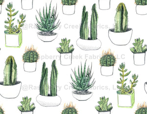 Watercolour drawings of cacti & succulent house plants in their little white pots.