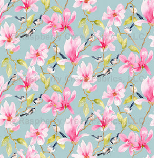 Hand painted watercolour magnolia blooms and cute birds on a soft teal background.