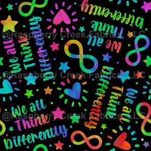 We All Think Differently Neurodiversity Support Autism Awareness Infinity Symbols Rainbow Hearts and Stars on Black