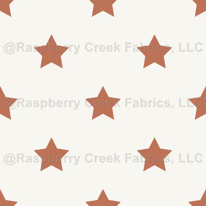 This warm terracotta star print brings classic western charm with bold five-point stars scattered across a soft cream background. The rustic color palette gives it a timeless cowboy feel perfect for children’s apparel, quilts, pajamas, and accessories. With its clean seamless repeat and earthy tones, this pattern blends beautifully into any western-inspired handmade collection.
