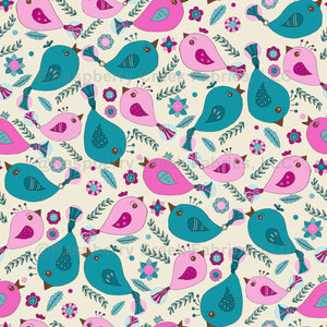 Whimsical Birds with tassels tails drawn in ink and painted digitally. The random flowers motifs are buttons with petals.