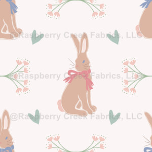Whimsical brown woodland rabbits with pink and blue bows in a damask style with accents of tiny hearts and flowers.