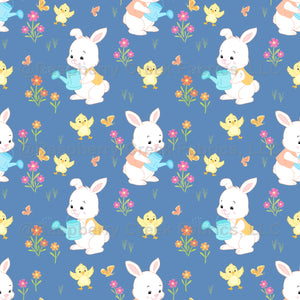 Adorable bunnies and chicks playing in a whimsical spring garden with blooming flowers in soft pastels. Perfect for kidswear, baby and nursery product.