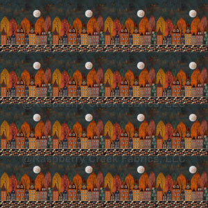 Whimsical Village In Autumn With Pumpkin Patch And Full Moon Over Trees With Turning Leaves