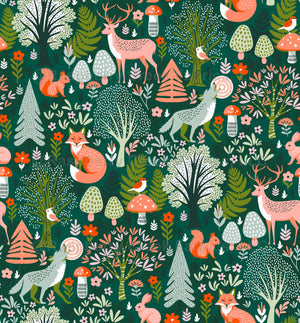 Woodland forest tree pattern with animals, foxes, deer, wolves, birds, rabbits, mushrooms, flowers on a dark green background for playful kids decor.