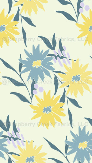 Whimsical yellow and blue wildflowers with purple abstract elements on a light pastel green background