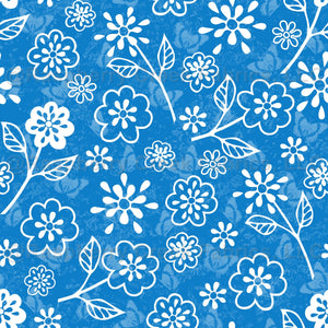 White outlines of assorted flowers on bluebell blue with butterflies textured background. Largest flowers are appx. 2" across at default 12" repeat, and appx 1" across at 6" repeat (300 dpi).