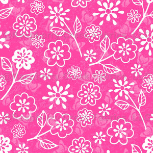 White outlines of assorted flowers on hot pink with butterflies textured background. Largest flowers are appx. 2" across at default 12" repeat, and appx 1" across at 6" repeat (300 dpi).