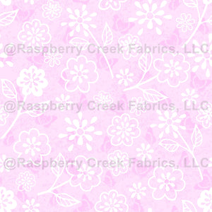 White outlines of assorted flowers on light pink with butterflies textured background. Largest flowers are appx. 2" across at default 12" repeat, and appx 1" across at 6" repeat (300 dpi).