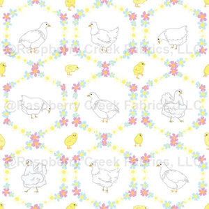 White Chickens and Cute Yellow Baby Chicks in Colorful Spring Floral Wreaths on a White Background