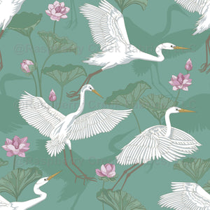 White egrets with pink lotus flowers and leaves on an aqua green background.