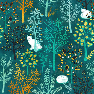 Emerald shaded forest with gold texturised reflexes and a lovely white fox resting near some of the trees.