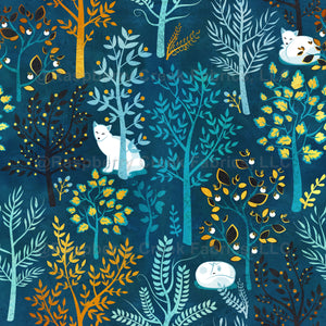 Blue shaded forest with gold texturised reflexes and a lovely white fox resting near some of the trees.
