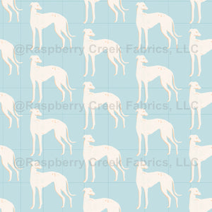 Elegant white greyhounds dogs pattern on light blue, ideal for stylish kids room textiles and DIY projects.