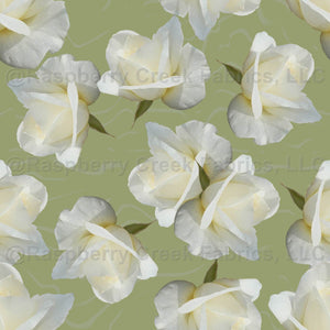 Creamy white rosebuds with a texture reminiscent of paper origami create a ditsy fabric design on a fern green background textured with a light grey abstract design like rippling ribbons.