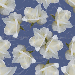 Creamy white rosebuds with a texture reminiscent of paper origami create a ditsy fabric design on a Marlin blue background textured with a light grey abstract design like rippling ribbons.