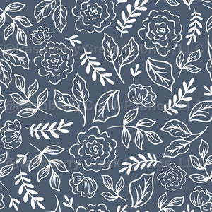 White sketchy flowers and leaves on blue background, ditsy florals, vintage blooms collection