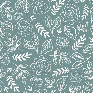 White sketchy flowers and leaves on sage green background, ditsy florals, vintage blooms collection
