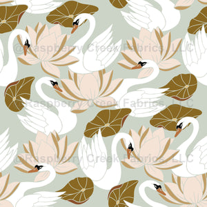 White Swan Peach Lotus Flower Art Nouveau Sage Green Botanical