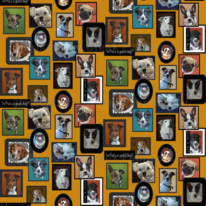 This colorful collage of line art drawings of friends' dogs on hot mustard can be used for crafts and home decor, and most especially for creating items like dog beds, pillows, and washable chair slip-covers.