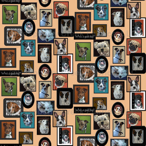 This colorful collage of line art drawings of friends' dogs on peach can be used for crafts and home decor, and most especially for creating items like dog beds, pillows, and washable chair slip-covers.